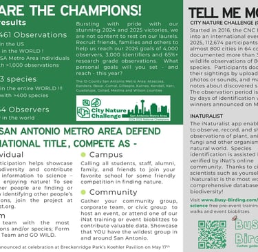 The City Nature Challenge is a friendly annual competition to see which area can catalog the most observations, species and participants. Through the awesome efforts of Citizen Scientists such as yourself, San Antonio Metro Area had dominated the competition not only in Texas, or the US but the ENTIRE FREE WORLD. But we cannot do it without your help so ....