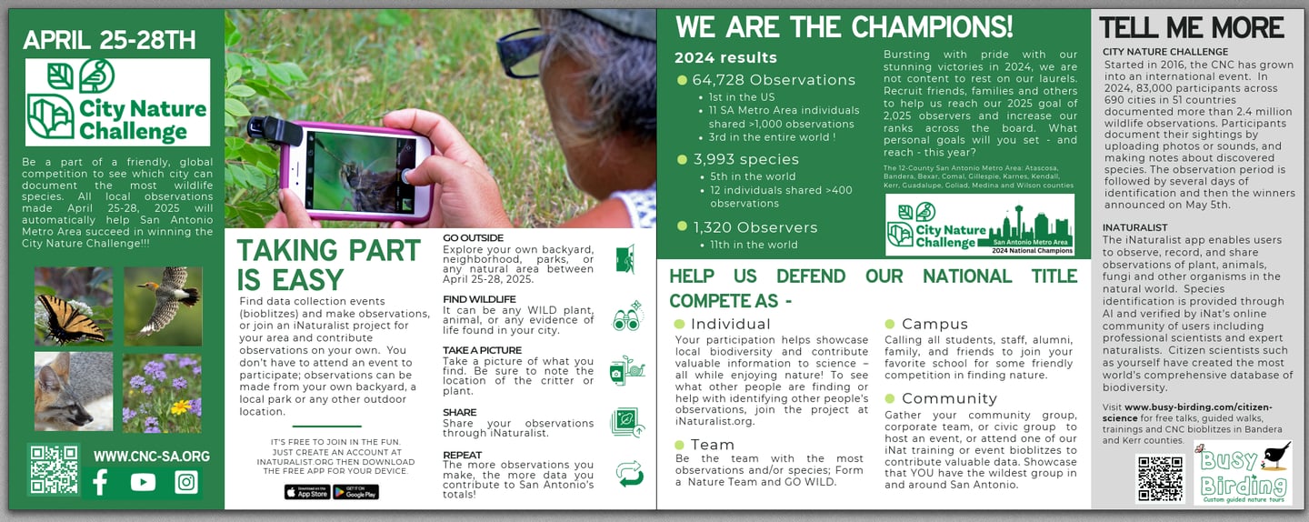 The San Antonio Metro Area, which includes BANDERA and 11 nearby counties, placed 3rd in the ENTIRE WORLD last year in this friendly competition to catalog all living creatures in our area. Please help our retain our title National Champs title in 2025