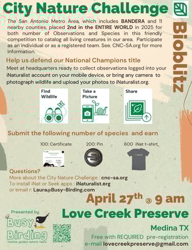 The City Nature Challenge is a friendly annual competition to see which area can catalog the most observations, species and participants. Through the awesome efforts of Citizen Scientists such as yourself, San Antonio Metro Area had dominated the competition not only in Texas, or the US but the ENTIRE FREE WORLD. But we cannot do it without your help so ....