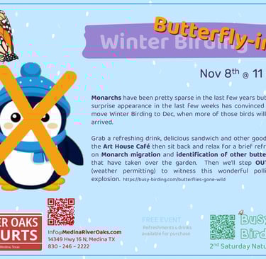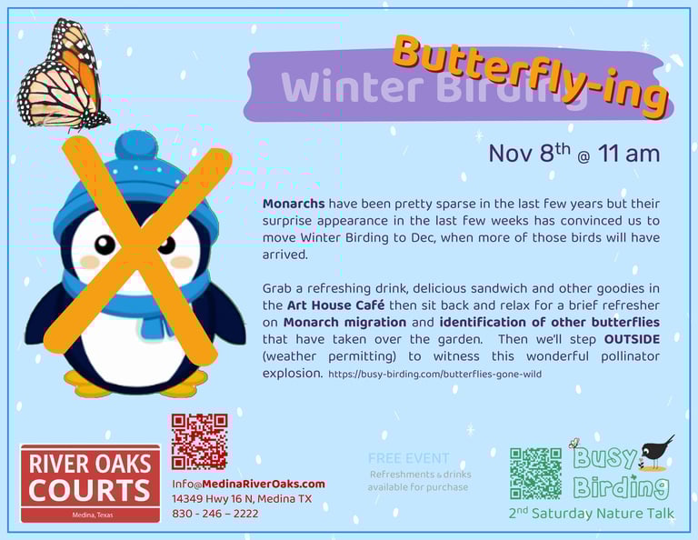 While Winter Birding is the scheduled topic, we’ll pivot to enjoy the surprise explosion of Monarchs. After a brief refresher on Monarch migration and the identification of other butterflies that have taken over the Medina River Oaks Garden, we’ll step OUTSIDE (weather permitting) to witness this wonderful pollinator explosion in person.